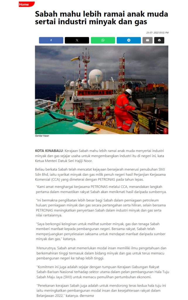 ARTIKEL The Sun : Sabah mahu lebih ramai anak muda sertai industri minyak dan gas